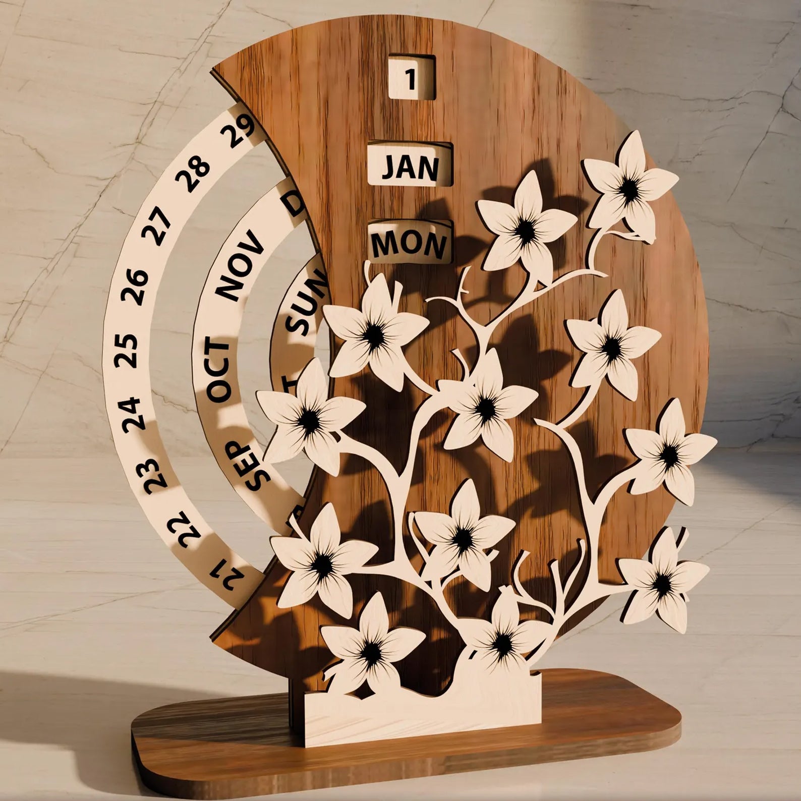 Календар створений із якісної деревини, вирізаний лазером із найвищою точністю. Його квітковий дизайн символізує оновлення, життя та гармонію, а природна текстура дерева додає тепла будь-якому простору.